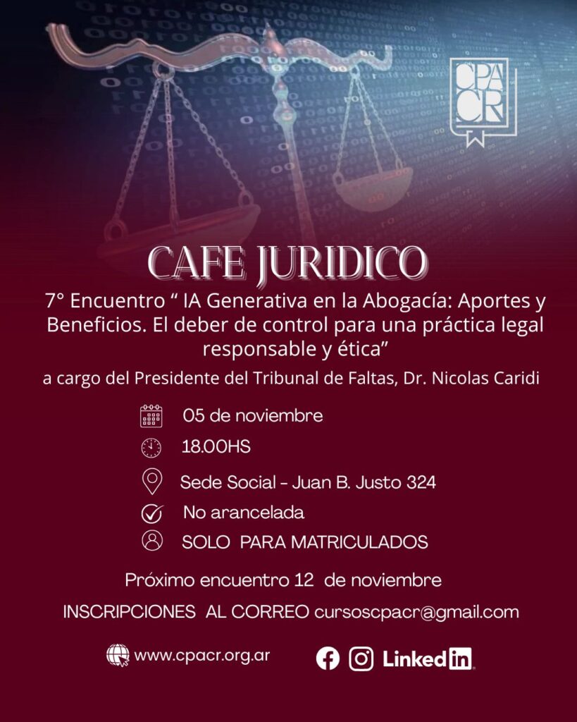Los invitamos al 7° Encuentro del CAFÉ JURÍDICO en donde abordaremos el tema “ IA Generativa en la Abogacía: Aportes y Beneficios. El deber de control para una práctica legal responsable y ética”, a cargo del Dr. Nicolás Caridi.