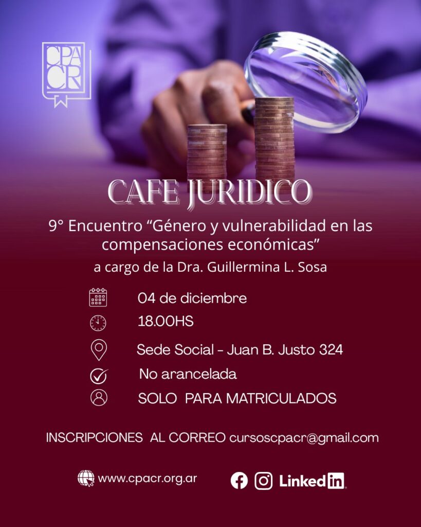 Los invitamos al 9° Encuentro del CAFÉ JURÍDICO en donde abordaremos el tema “Género y vulnerabilidad en las compensaciones económicas”, a cargo de la Dra. Guillermina L. Sosa